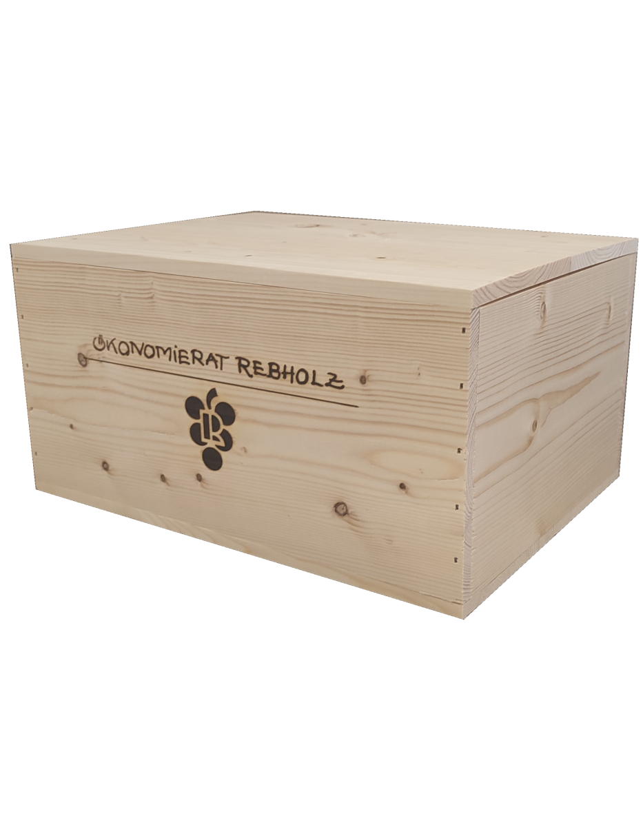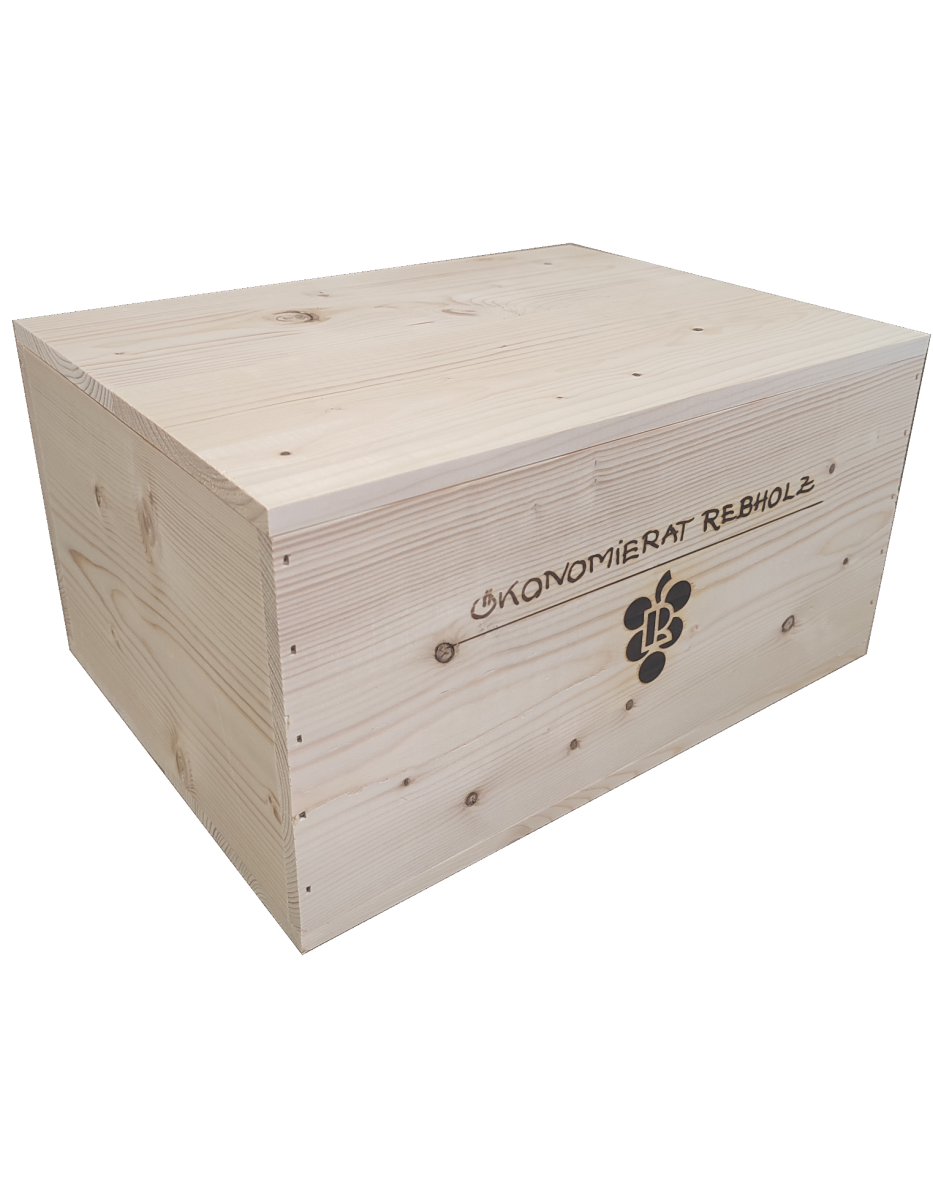 Stilvolle Holzkiste mit Rebholz-Branding. Für sechs Flaschen á 0,75l.
